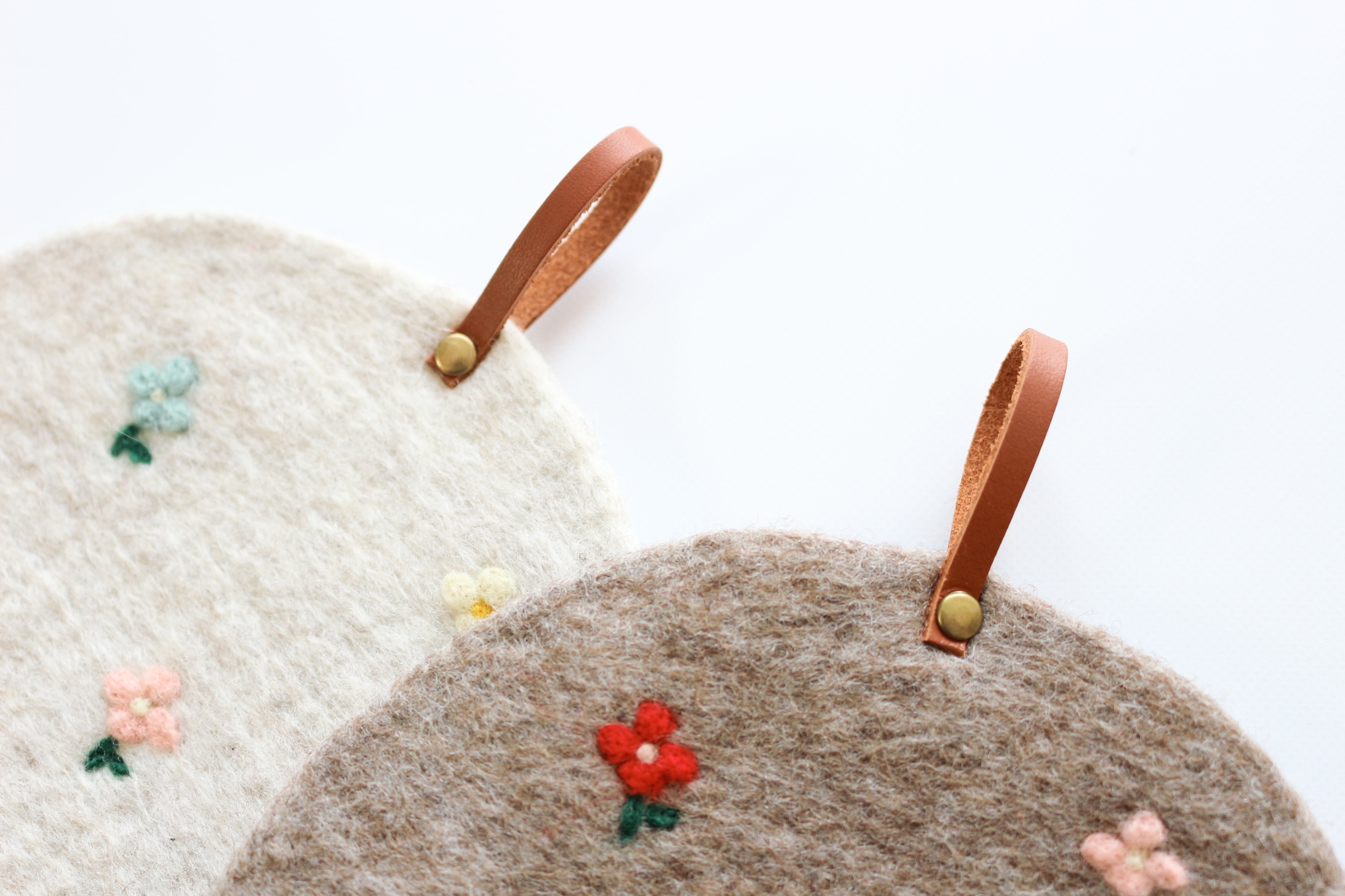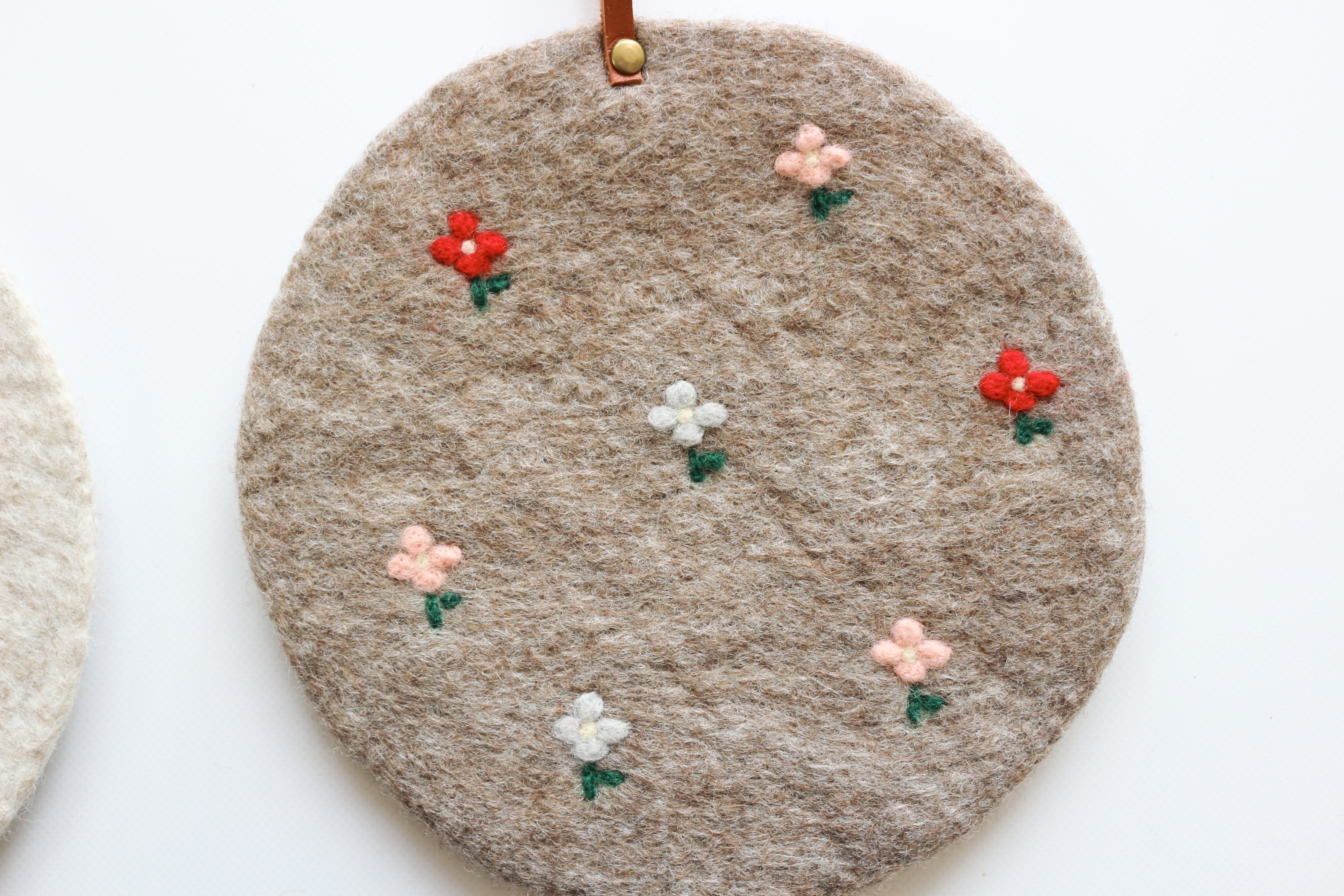 Each piece is made using natural, undyed wool as the base, with flowers carefully embroidered by hand.